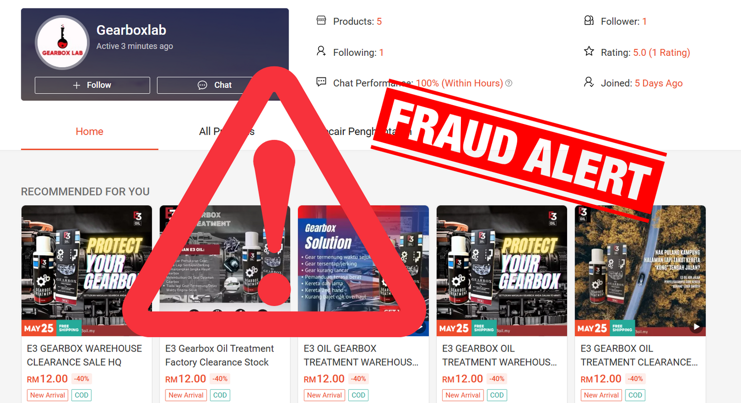 Notis amaran penting. Pihak E3 Oil tidak pernah mengedar kepada 'Shopee Shop' dan iktiraf pengedar ini. 'Seller' ini didapati mahu menjatuhkan imej dan kredibiliti syarikat kami dengan memasarkan produk tiruan dengan harga yang jauh lebih murah daripada pengilang dan pengedar. Para pelanggan disarankan membuat laporan kepada 'Shopee' untuk mengelakkan kekeliruan bagi pengguna di masa akan datang.